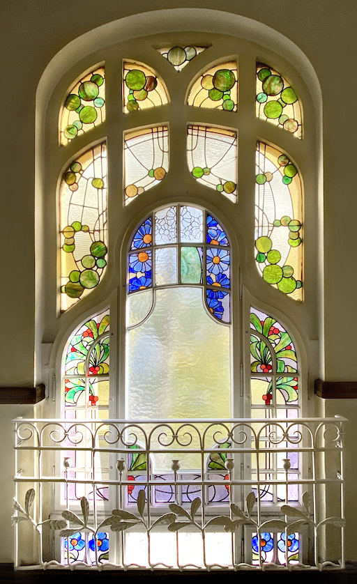 Im vierten Stock ergänzen drei Rundbogenfenster aus grünen Blättern den fragilen Garten. Im Erdgeschoss sind zusätzlich zwei kleine quadratische Fenster mit Mohnblüten zu finden. Der Schlafmohn steht im Jugendstil für eine Flucht aus der Realität, seine halluzinogene Wirkung wird romantisiert. Der bzw. die Glasmaler können auch in den Bauakten nicht ermittelt werden.