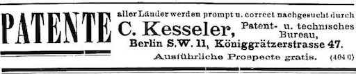 | 01.07.1877 | Eröffnung eines Patent- und Technischen Bureaus von Civil-Ingenieur und Patentanwalt C. Kesseler |